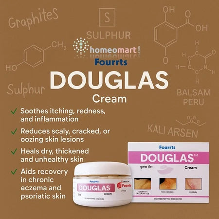 Fourrts Douglas Cream is a dermatologist-trusted homeopathic solution for eczema, psoriasis, and dermatitis. With ingredients like Graphites, Sulphur, and Urea, it calms itch, repairs cracked skin, and restores smoothness — all without harsh chemicals.
