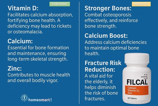 Filcal's potent blend targets the foundation of your bone health with key ingredients like Calcium Carbonate, Zinc as zinc sulphate monohydrate, and Vitamin D3 (Cholecalciferol), acting as a critical supplement to enhance your wellbeing.