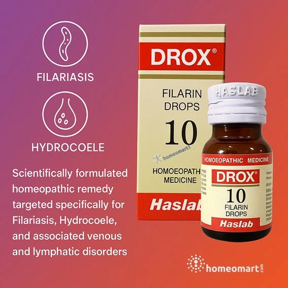 Homeopathic relief for filariasis, hydrocoele & varicose conditions. Drox 10 Filarin drops by Haslab eases swelling, itching & inflammation naturally.