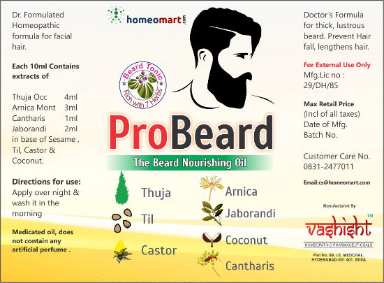 ProBeard Oil: Jojoba, Castor, Coconut, Sesame, Thuja, Cantharis, and Jaborandi—targeted for growth, strength, and shine.