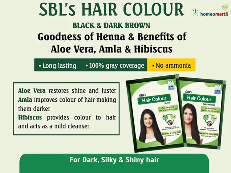 SBL Hair Color is a henna-based herbal hair colour with the goodness of rich natural Indian herbs like Aloe Vera, Amla and Hibiscus. This product is Ammonia-free and provides 100 percent Gray coverage leaving your hair silky and Shiny. It provides nourishment to hair, making them dark, shiny and soft.