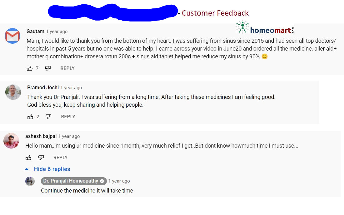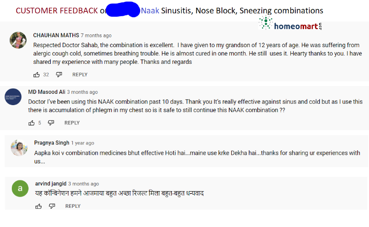 Real customer feedback and testimonials validate the success of these doctor-recommended homeopathic sinusitis relief medicines (refer inset image).