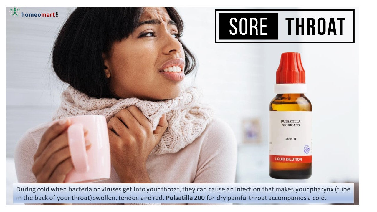 - Pulsatilla 200: Suited for dry, painful throats accompanying colds. Symptoms include a scraping sensation, rawness, and a dry cough with thick phlegm, worsening indoors but improving in open air.