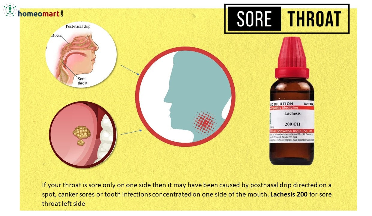 - Lachesis 200 - Best for a sore throat with a purple appearance, where any pressure, even from a necktie, feels unbearable. Pain arises when swallowing saliva or liquids, particularly affecting the left side. This condition could stem from unilateral postnasal drip, canker sores, or dental infections on one side