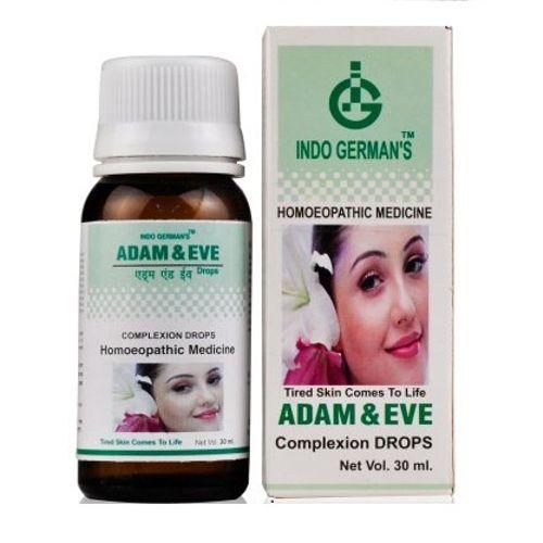 Indo German Adam and Eve Complexion drops is Indicated for Acne vulgaris, pimples, comedones, black head, dry and rough skin, allergic condition. For lighter skin tone, especially recommended for dark rings around eyes.