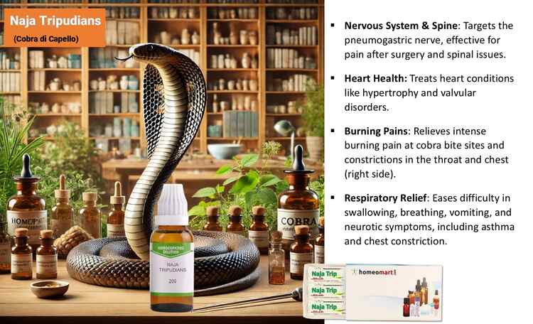 - Burning Pains: Intense burning pain at the site of cobra bites can be relieved with Naja Tripudians, along with symptoms of constriction in the throat and chest, typically felt on the right side.