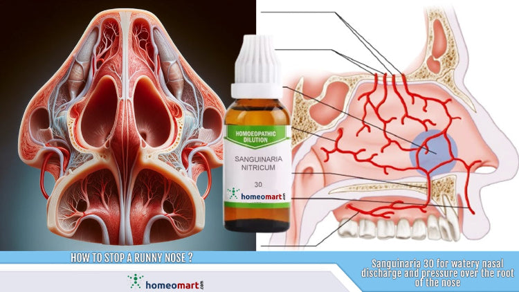 - Sanguinaria Nit 30. Sanguinaria Nitricum patient shows watery, nasal discharge or burning nature. Other symptomatic features are pressure over the root of the nose, plugged sensation in nostrils, enlarged nasal turbinates’, sneezing, and yellow, bloody mucus discharge from the nose.