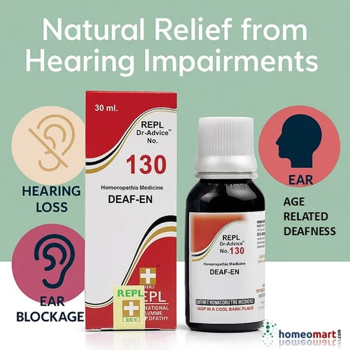 REPL Dr. Advice No. 130 (DEAF-EN) is a homoeopathic remedy formulated to address various types of hearing loss and deafness, including conductive hearing loss, which may affect one or both ears. This remedy is especially effective in managing age-related hearing difficulties and challenges in understanding conversations. By targeting both the underlying causes and symptoms, REPL 130 provides natural support for improved hearing.