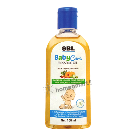 SBL Baby Care Massage Oil is a massage oil enriched with the goodness of calendula, jojoba, olive, almond, aloe vera, neem and rosemary natural oils. It nourishes and softens the delicate skin of the baby. It works well to strengthen the baby’s bones and muscles, which help improve the child's growth and development.