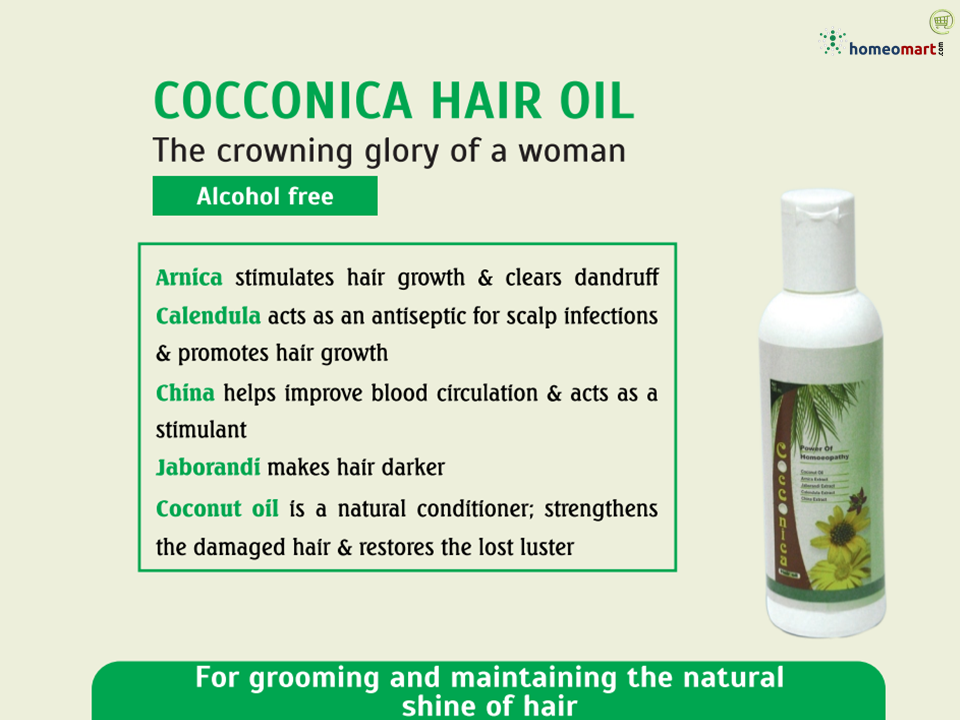 Homeopathy hair grooming Hair Oil - SBL Cocconica is indicated for long and shiny hair and is a unique natural formulation of coconut oil fortified with advantages of homoeopathy to provide strength to hair follicles for longer, softer and lustrous hair.