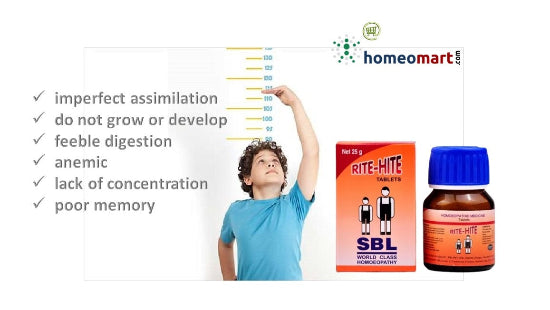 Unlock your child's full growth potential with SBL Rite Hite Tablets, the trusted homeopathic growth promoter. Specifically designed for children facing challenges like imperfect assimilation, stunted growth, weak digestion, anemia, and concentration or memory issues, this formula is here to make a difference.
