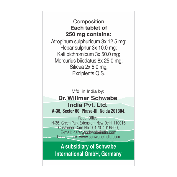 Each Tablet of 250Mg Schwabe Alpha-Tons tablet contains Atropinum Sulphuricum 5x 12.5 Mg, Hepar Sulphuris 3x 10.0 Mg; Kalium Bichromicum 4x 50.0Mg; Mercurius Biniodatus 8x 25.0 Mg; Silicea 2x 5.0 Mg; Excipients Q.S. To Make 250Mg.