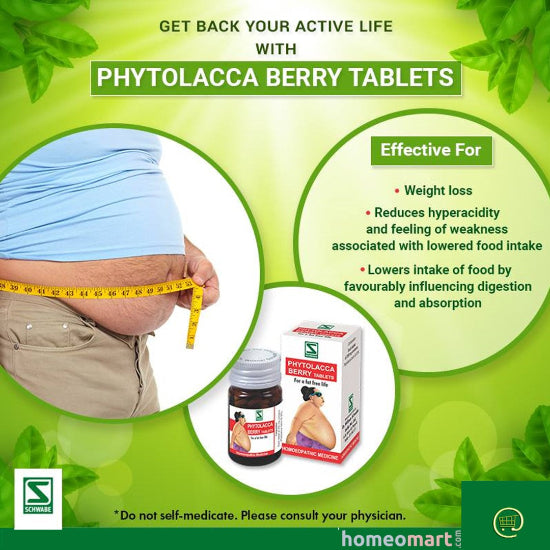 Dr. Willmar Schwabe's Phytolacca Berry Tablets are made from fresh berries which are native of North America by a process preserving nature's goodness in the final product for optimum efficacy. It contains ingredients which have an appetite regulating action. If taken for prolonged periods with above suggestions, it helps to reduce and maintain the body weight.
