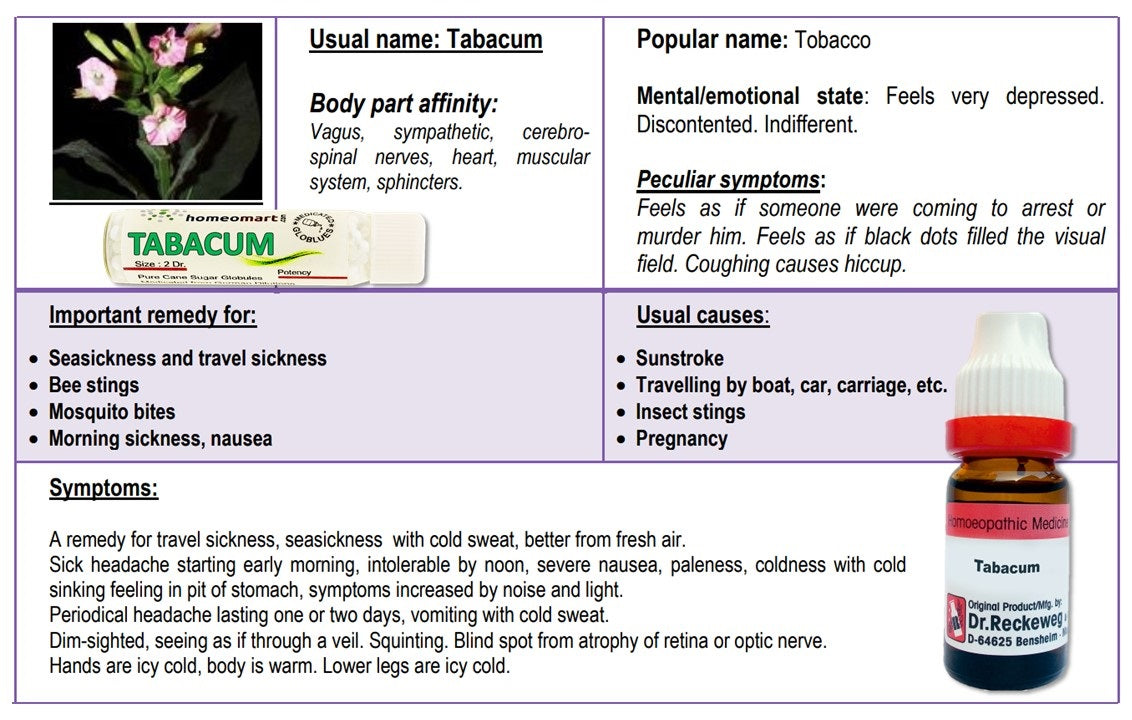 - Tabacum are the top homeopathic remedies used to treat motion sickness.