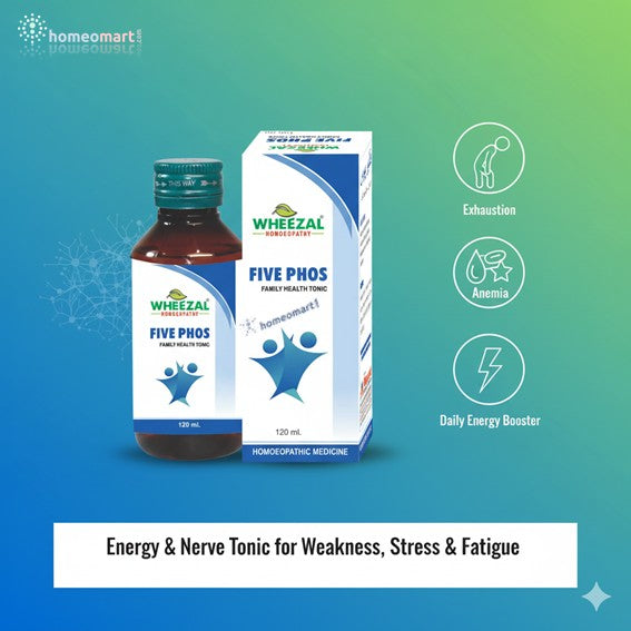 Wheezal Five Phos Syrup is a daily energy-restoring tonic designed for people who feel physically exhausted, mentally drained, or weak due to stress, overwork, illness, or nutritional deficiencies. Enriched with essential phosphates of Calcium, Iron, Magnesium, Potassium, and Sodium, along with powerful tonics like Avena Sativa and Ashwagandha, it strengthens the nervous system, muscles, and overall vitality. Suitable for all age groups, it helps restore stamina, improve concentration, and enhance well-being.
