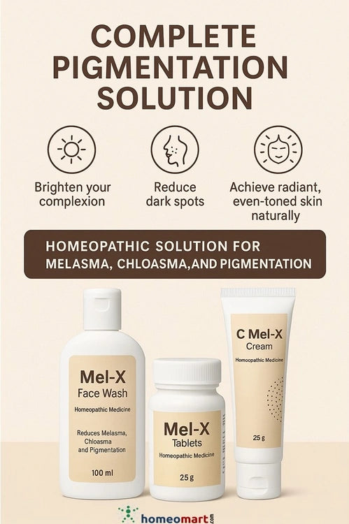 Transform your skin with Wheezal Mel-X! A powerful homeopathic solution for melasma, chloasma, and pigmentation, combining Mel-X Tablets, Cream, and Face Wash for complete internal and external care. Brighten your complexion, reduce dark spots, and achieve radiant, even-toned skin naturally. Safe, effective, and trusted by dermatology experts!