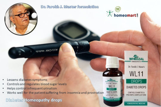 Wheezal WL11 Diabetes Drops is a clinically formulated homeopathic remedy by renowned practitioner Dr. Farokh J. Master, developed to help manage diabetes mellitus and its associated complications. This unique blend stimulates pancreatic function, promotes insulin secretion, and supports glucose metabolism — offering a holistic approach to managing both Type 1 and Type 2 diabetes.