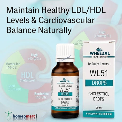 Wheezal WL-51 Drops is a targeted homeopathic formulation that helps maintain healthy LDL (bad) and HDL (good) cholesterol levels. Designed to support overall cardiovascular function, this remedy assists in regulating lipid profiles, improving circulation, and managing associated symptoms such as breathlessness, fatigue, and heaviness in the chest.